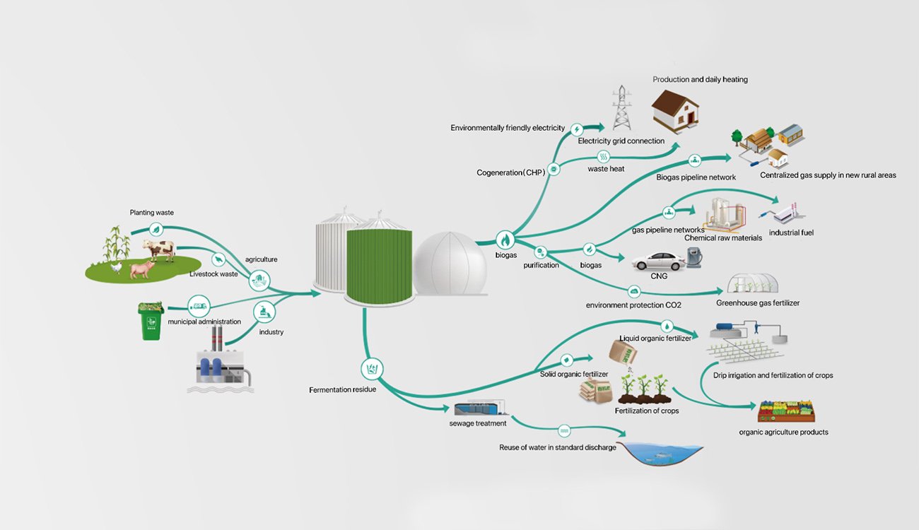 The technological process of a biogas project generally includes such links as raw material collection, pretreatment, anaerobic fermentation, biogas collection and purification, and biogas residue and slurry treatment, which are specified as follows: